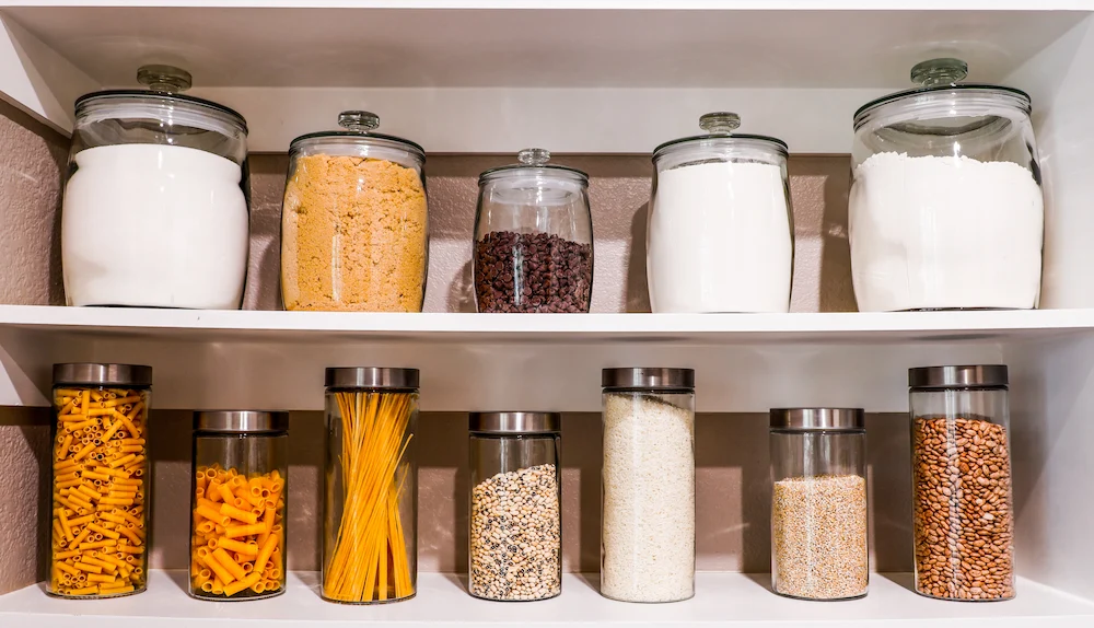 - Glass or acrylic containers with tight lids for flour, rice, and pet food