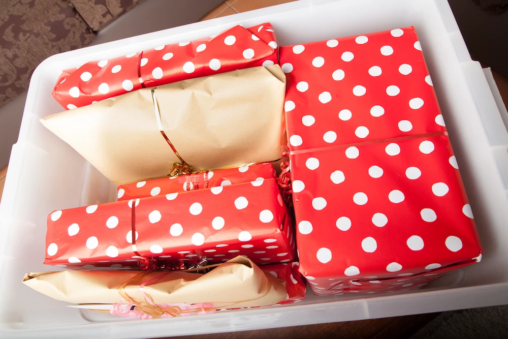 - Store long-term gifts in lidded plastic bins, not open cardboard.